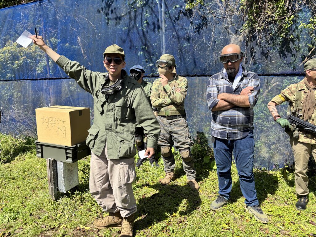 「いかれた政策に耳を傾けてはいけません。山中合戦場はこれからもサバゲー場としてやっていきます。どうか私に投票をお願いします。うんぬんかんぬん」